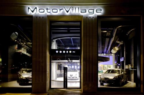 「モーター・ヴィラージュ」はシャンゼリゼ大通りのショッピング街および公園緑地の境目にある「ロンポワン(ロータリー)シャンゼリゼ」に面している。隣接する薬局の緑十字看板が目印だ。